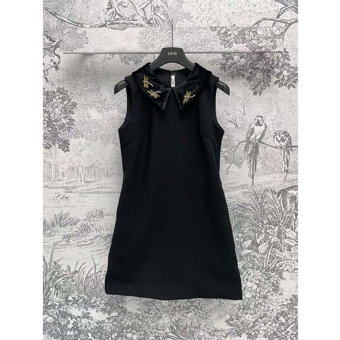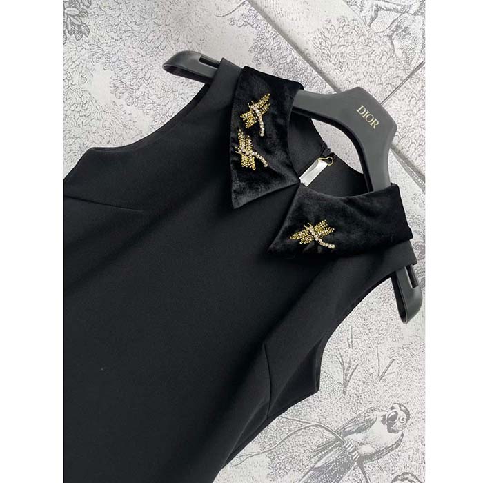Dior CD Affordable Replica Women CD A-Line Embroidered Dress Black Wool Silk Dragonfly Embroidery