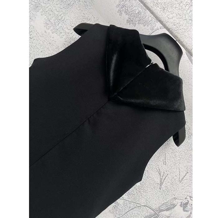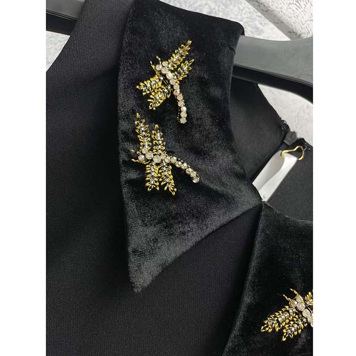 • The dress is both modern and timeless. Crafted in lightweight black wool and silk, it features a sleek A-line silhouette complemented by velvet paneling showcasing the collection’s flagship and House-inspired dragonfly motif delicately embroidered in metallic gold-tone thread, resin pearls and crystals.