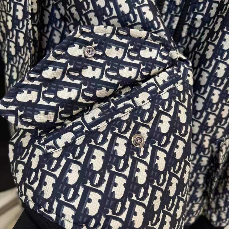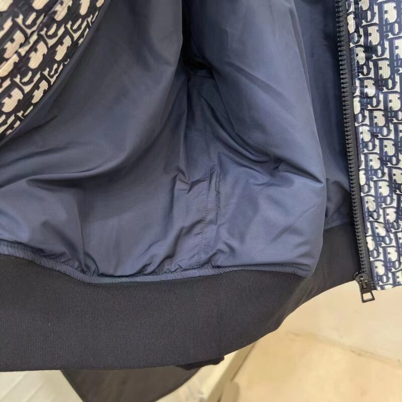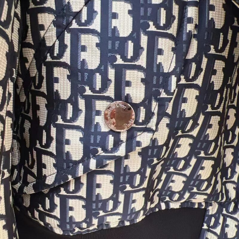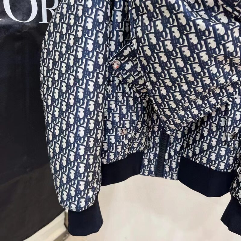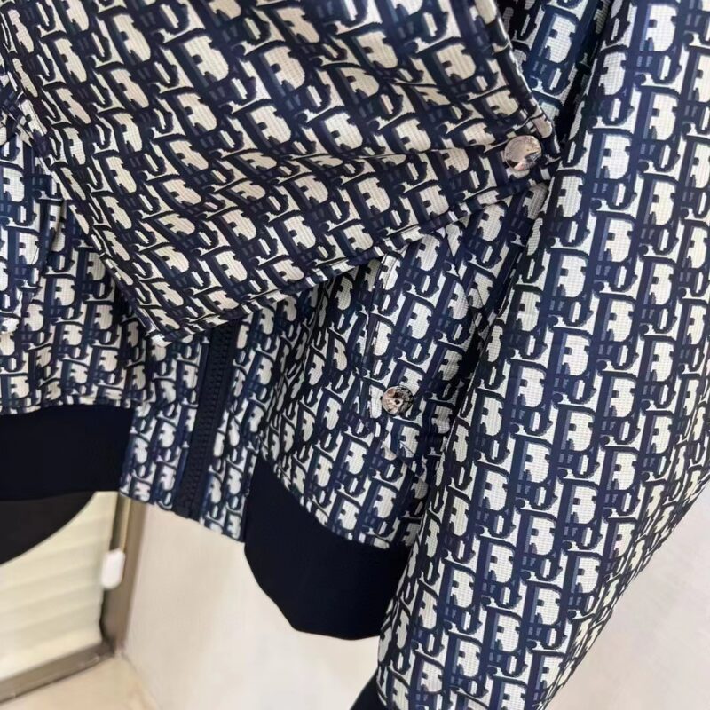 - The bomber jacket is available in a blue and ecru Dior Oblique motif, a House symbol since it first appeared in 1967.