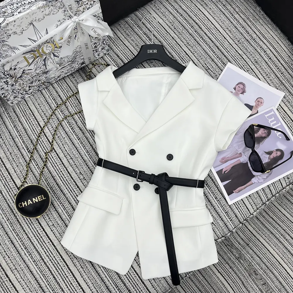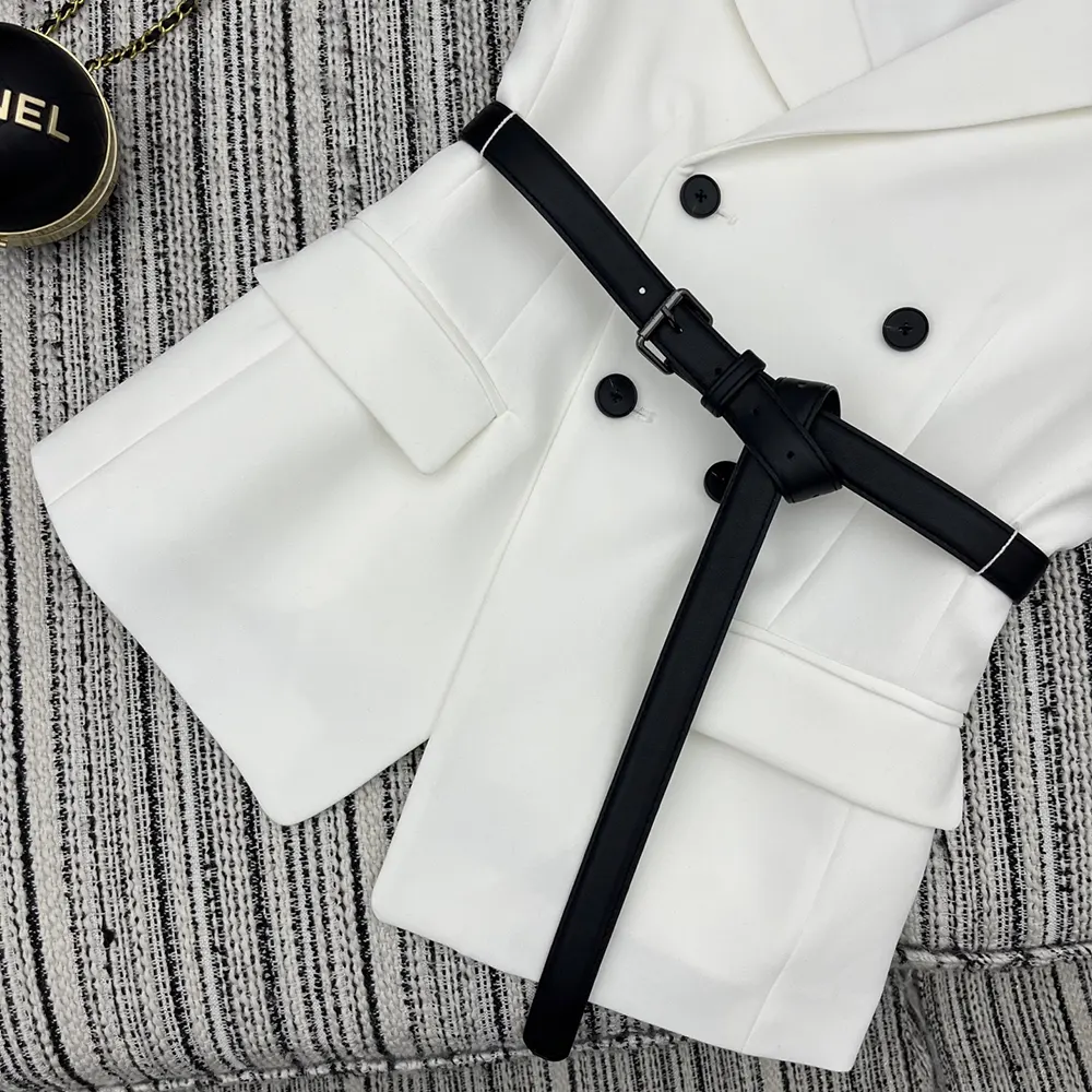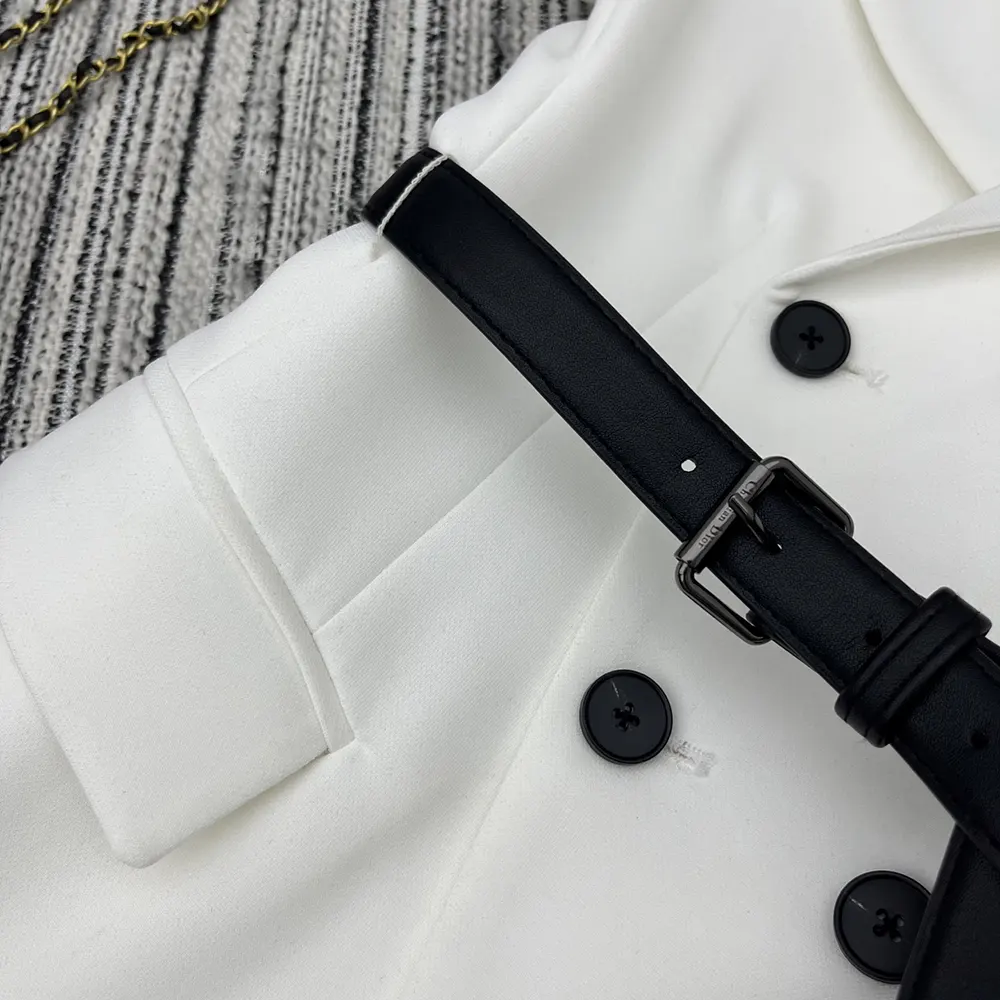 - double-breasted closure and flap pockets, while a black leather belt highlights the waist.
