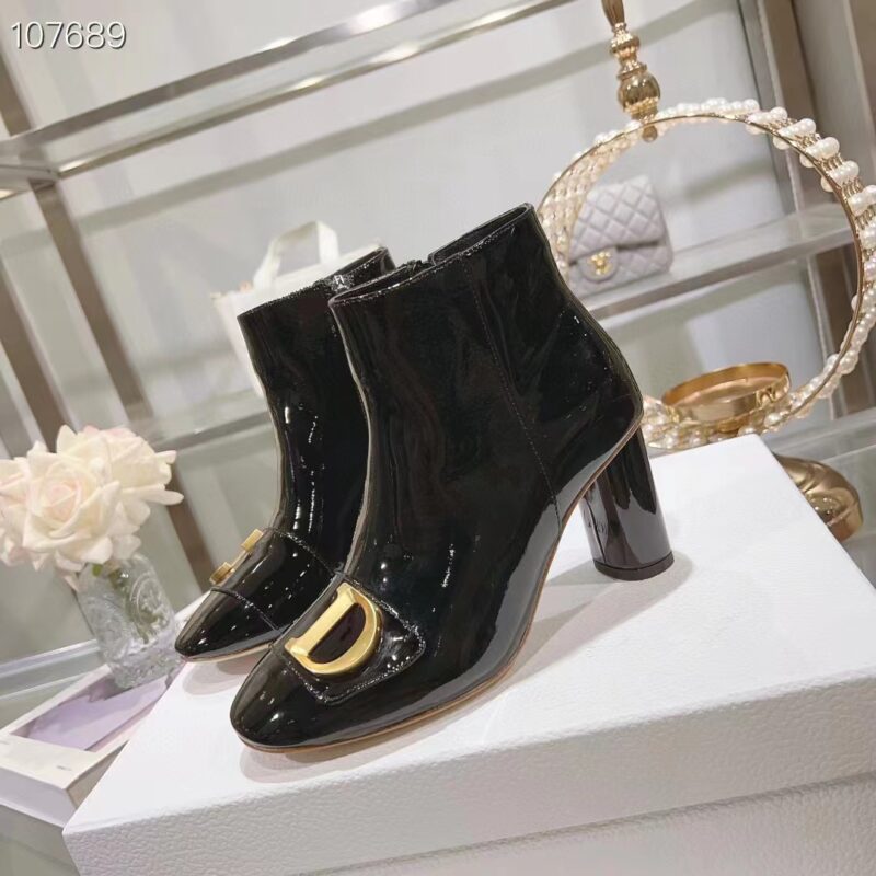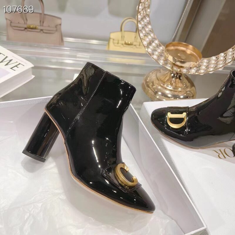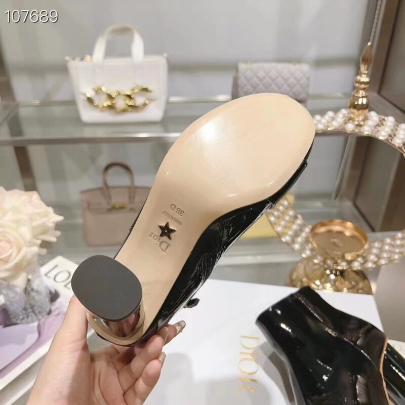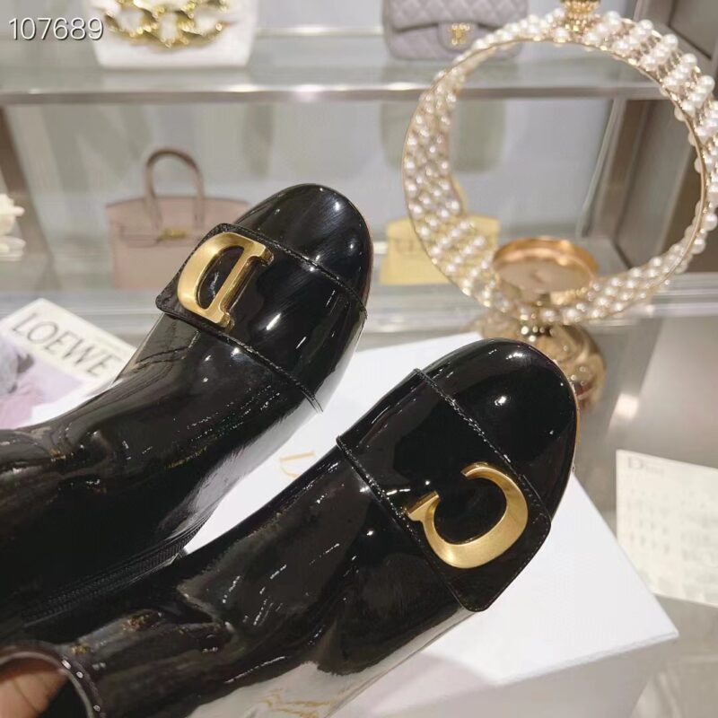 - Crafted in black patent calfskin, the streamlined style is enhanced by gold-finish metal C and D letters, inspired by House archives.