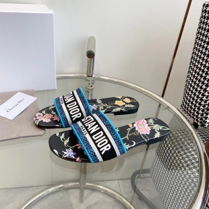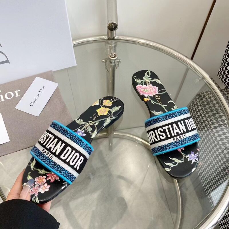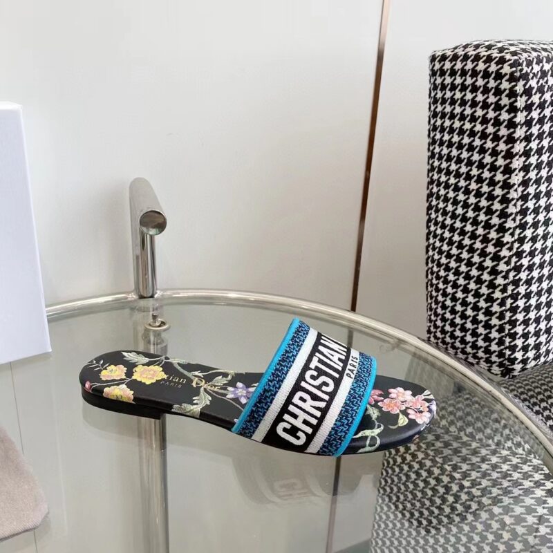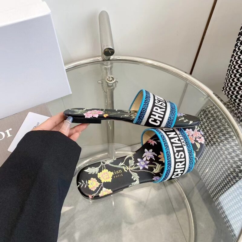 Fake Designer Dior Women CD Dway Slide Black Multicolor Embroidered Cotton Dior Petites Fleurs