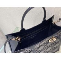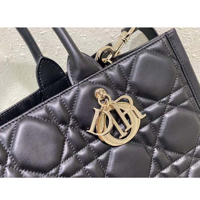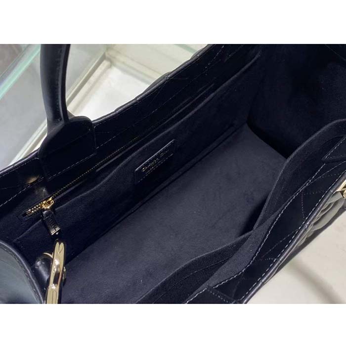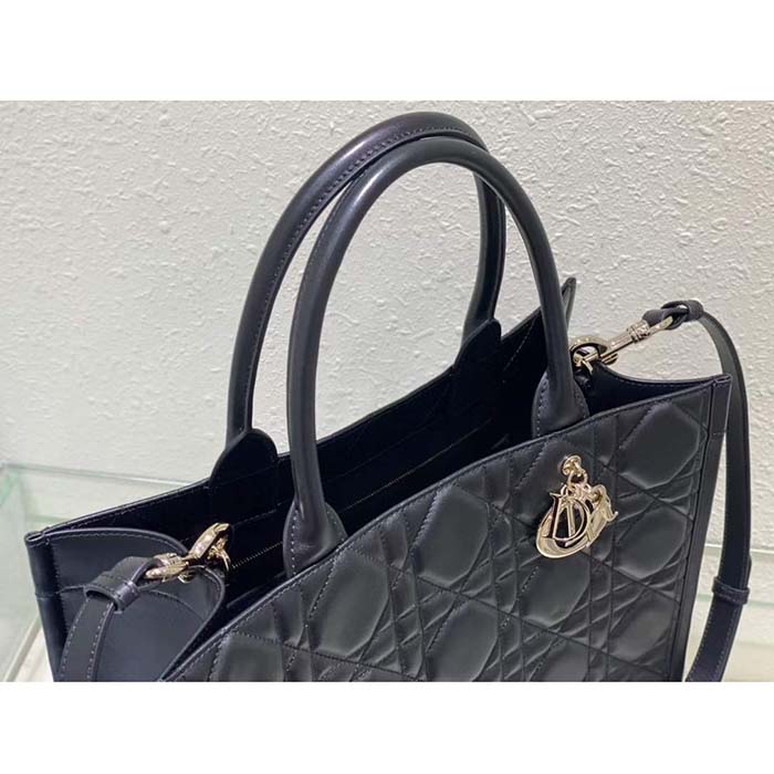 - Crafted in black calfskin, the design showcases the Macrocannage motif and is embellished with pale gold-finish metal D.I.O.R charms on one of the handles.