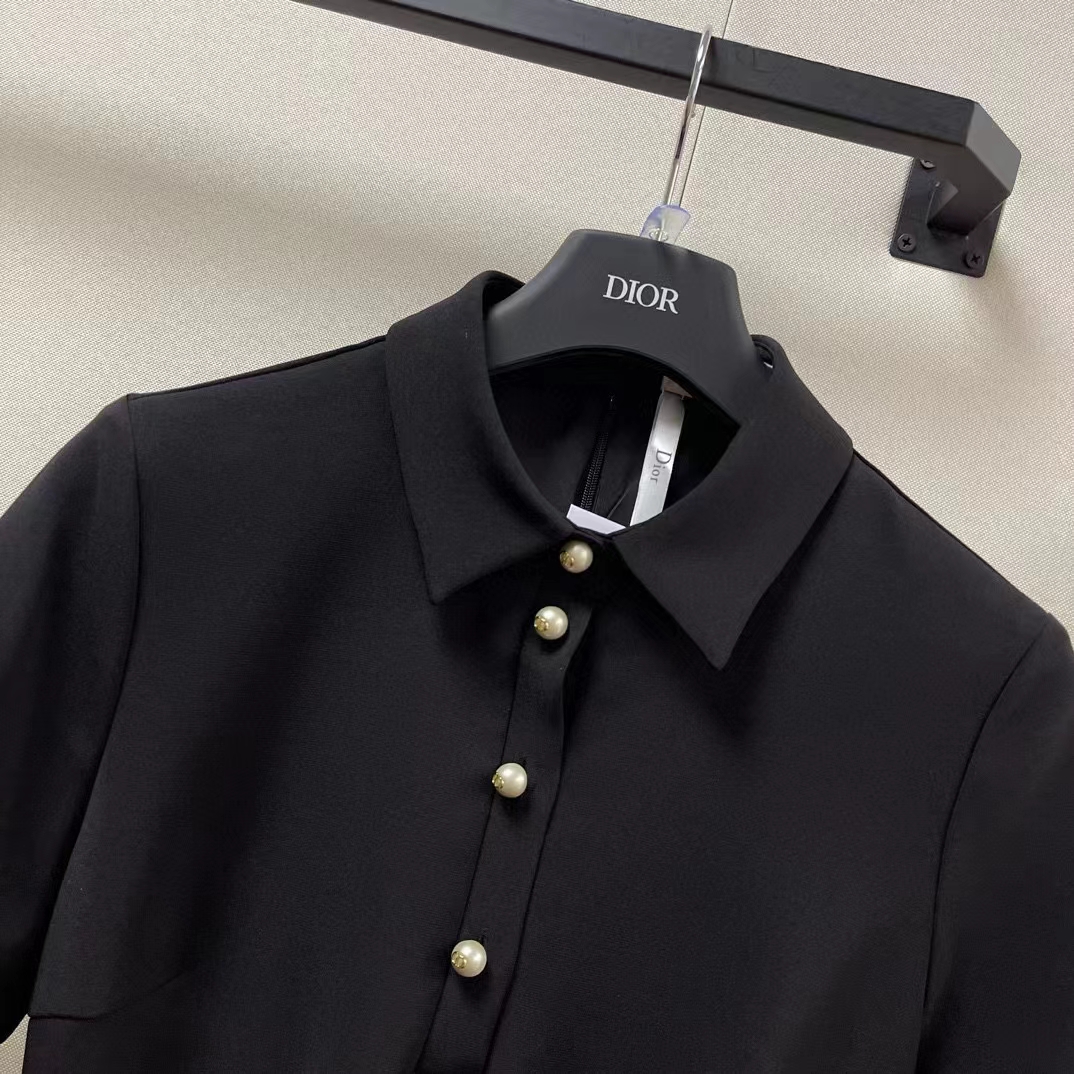 • Crafted in black lightweight wool and silk, it is distinguished by a flared cut embellished with Dior Tribales buttons, showcasing a resin pearl and CD signature inspired by the iconic House earring. Completed by a tonal belt highlighting the waist, the short-sleeved dress will create contemporary, refined looks.