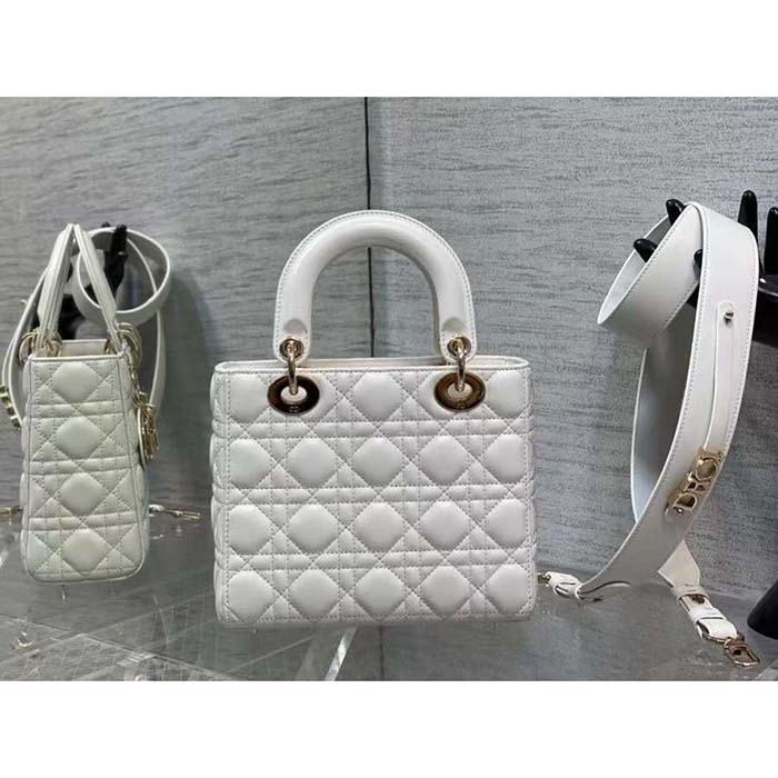 • Featuring a thin, removable leather shoulder strap, the small Lady Dior bag can be carried by hand or worn crossbody.