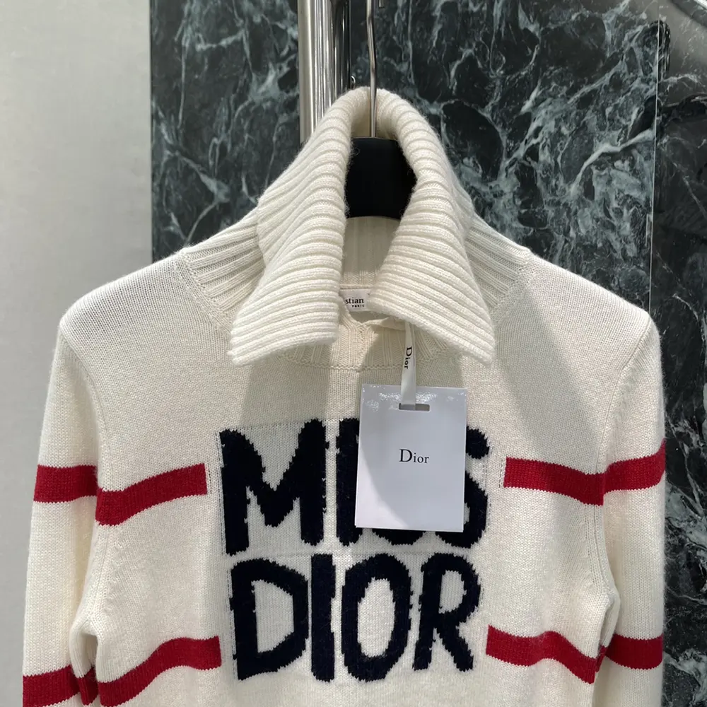 - Part of the DiorAlps capsule, the mock neck sweater showcases the blue Miss Dior Graffiti motif,