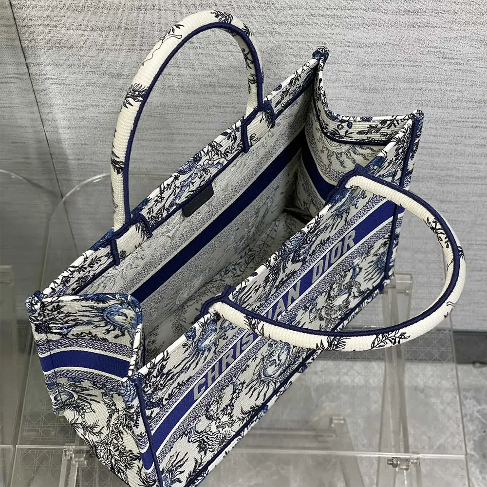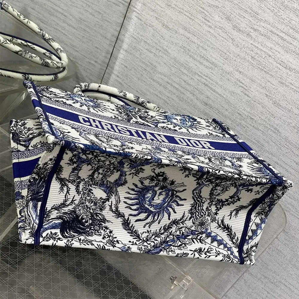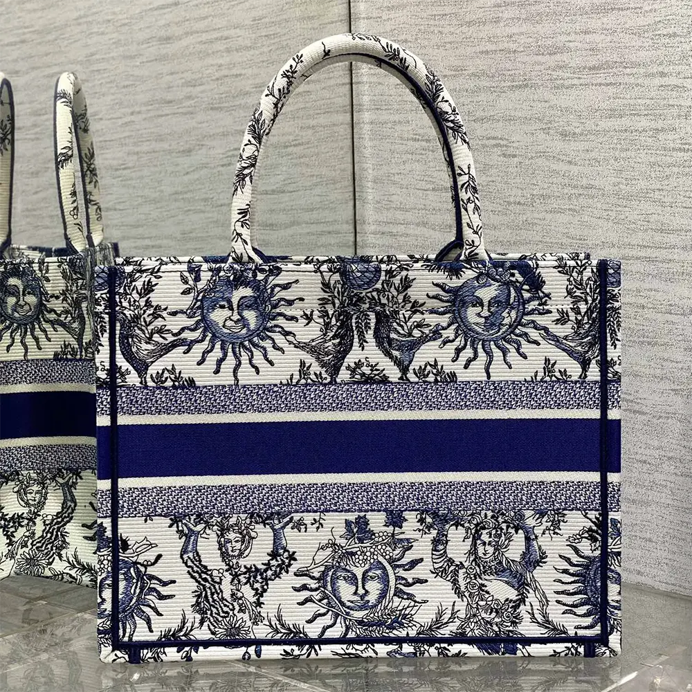 Dior Women Medium Dior Book Tote Luxury Replica White and Navy Blue Toile de Jouy Soleil Embroidery