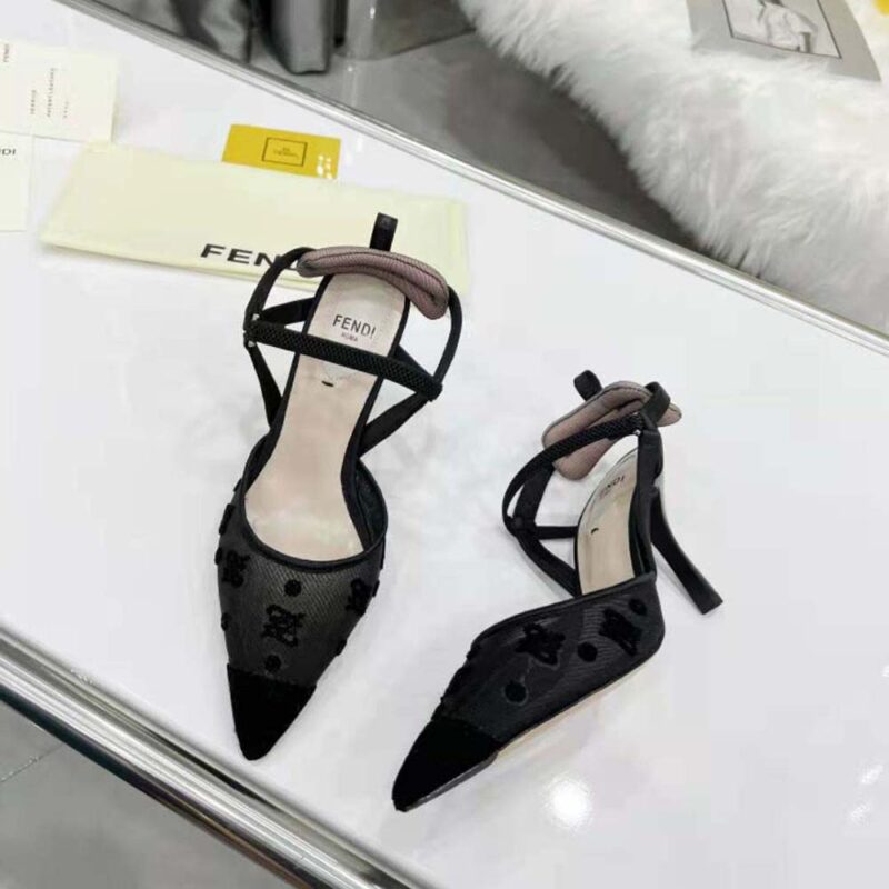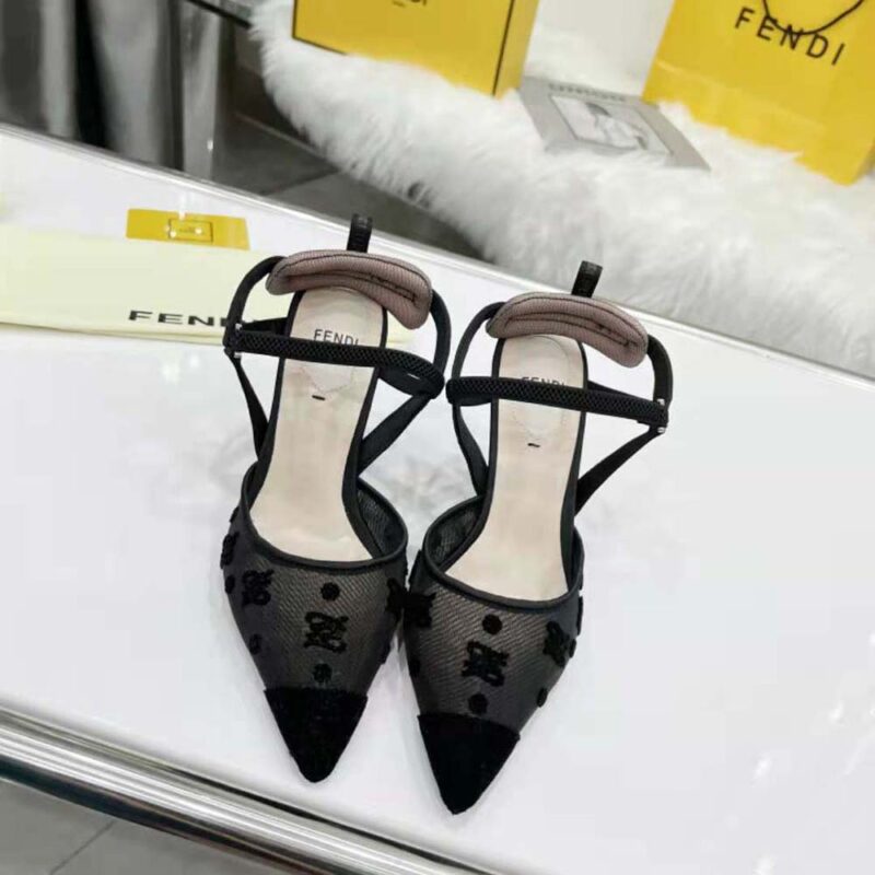 Fendi Women Colibri Lite High-Heeled Black Mesh and FF Karligraphy Slingbacks