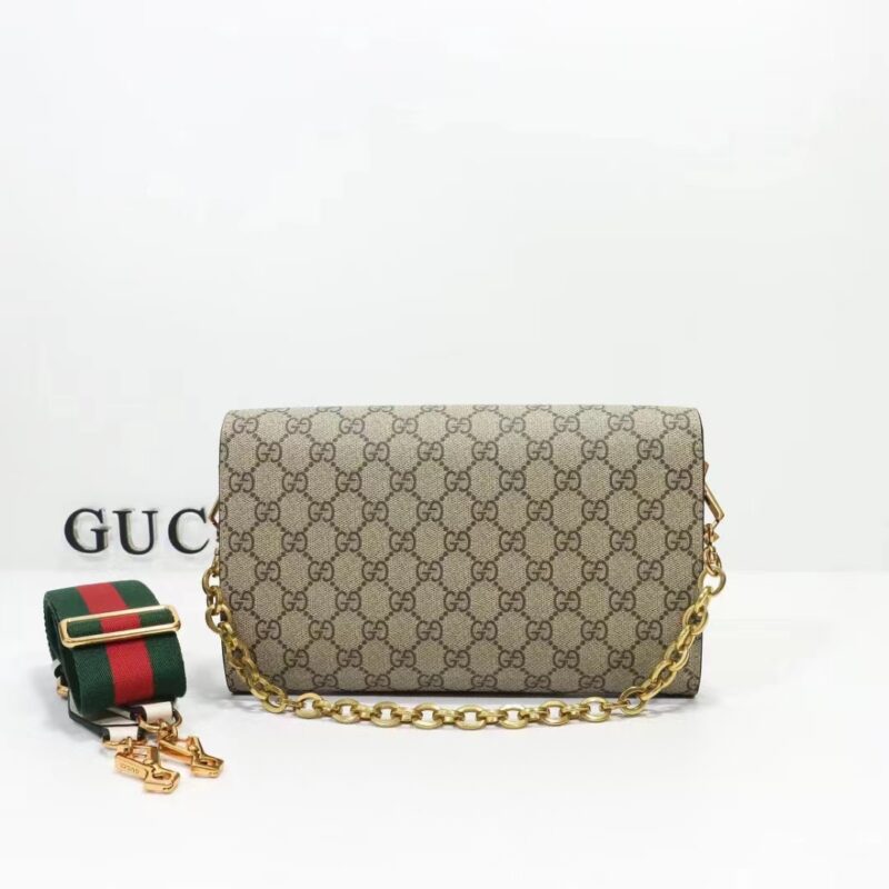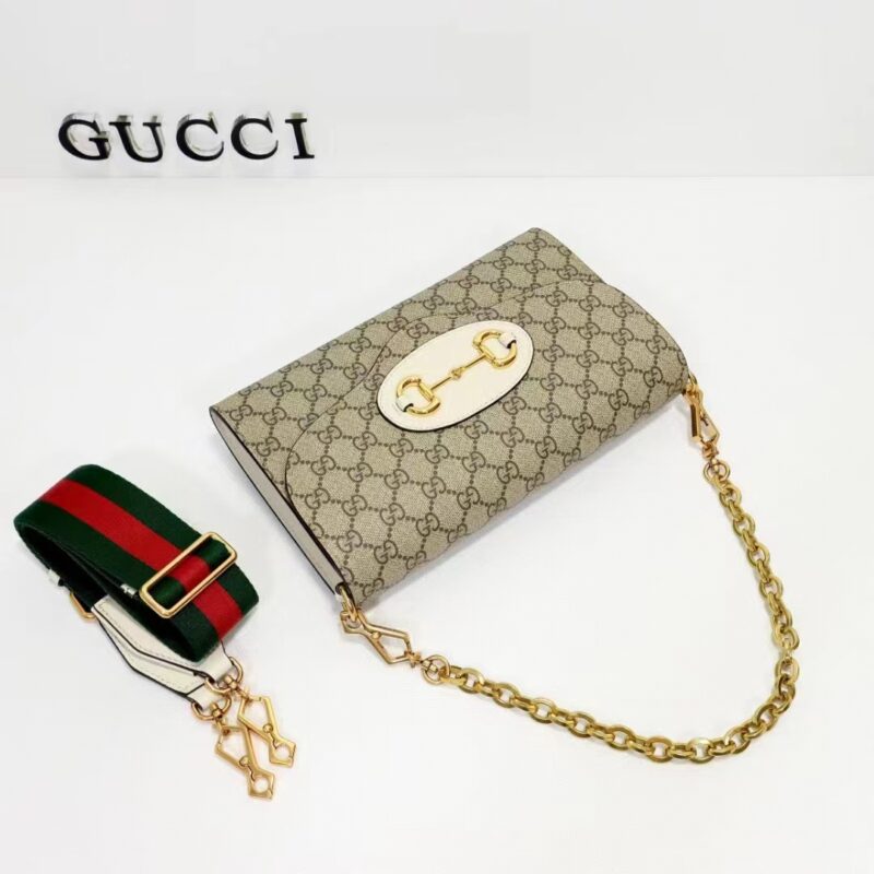Gucci Women Horsebit 1955 Small Bag Beige Ebony GG Supreme Canvas White Leather
