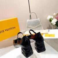 • This model is distinguished by its V-shaped block heel, which is decorated with a crisscross Malletage pattern evoking the lining of Louis Vuitton trunks.
