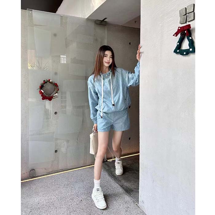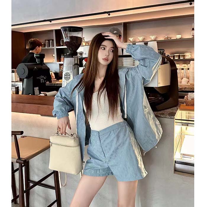 - This staple parka is reimagined for summer in a fresh baby blue shade featuring an allover Monogram print detailed with classic Monogram canvas accents on the drawstrings for a classic House touch. The comfortable sporty silhouette is lined with breathable mesh and finished with a practical hood, large front pockets and elasticated cuffs.